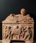 Cinerary urn with the representation of a funeral procession, alabaster, second century BC. BC, Museo Etrusco Guarnacci, Volterra, Photo Arrigo Coppitz (exhibition at the Pinacothèque, Paris).
